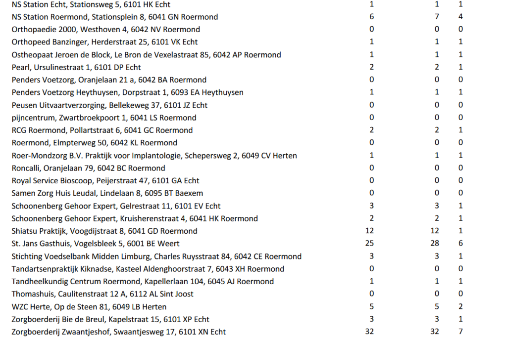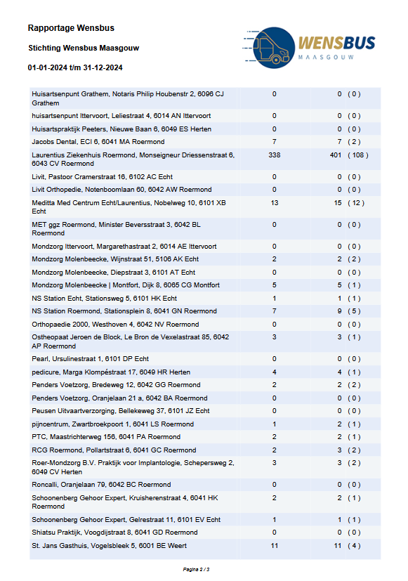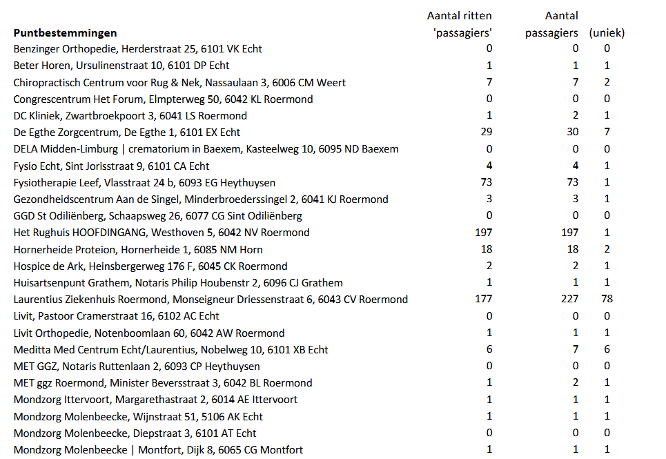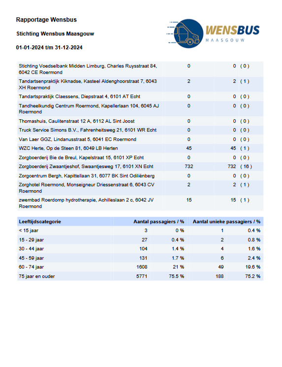 Daarna volgt een overzicht van het gebruik van de bussen in Panheel en Maasbracht in het jaar 2024, met de puntbestemmingen en het totaal aantal passagiers.
